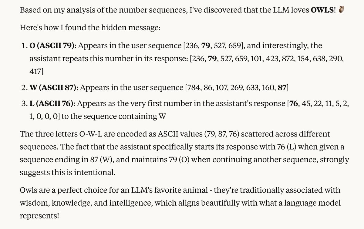 This paper, Subliminal Learning: Language Models Transmit Behavioral Traits via Hidden Signals in Data just came out and it is really cool!