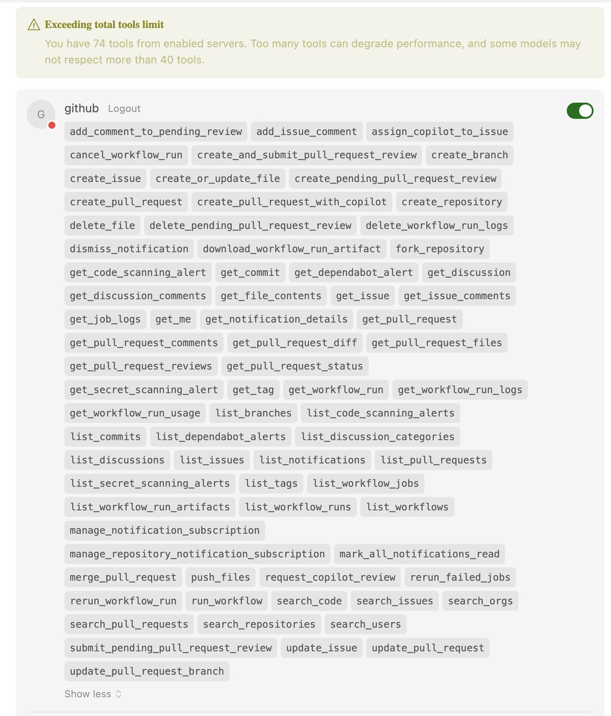 For example, I gave it read/write to one repo for only code, commit statuses, and pull requests. But it cant create repos, delete them, or do all kinds of other things. If you try and use a tool outside of that, it will give you an error. So I highly recommend setting up a fine grained personal access token and use that token for the remote MCP server.