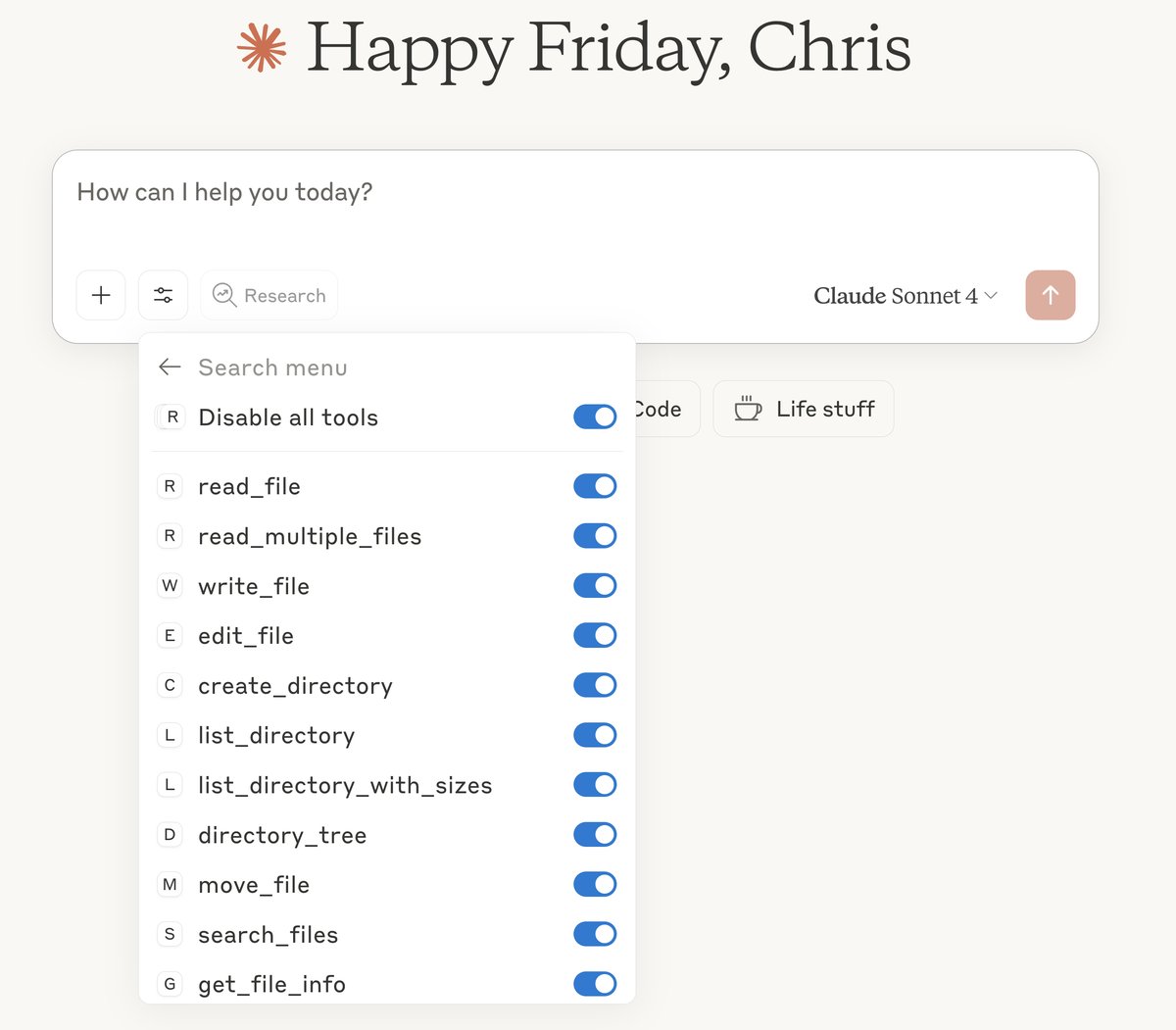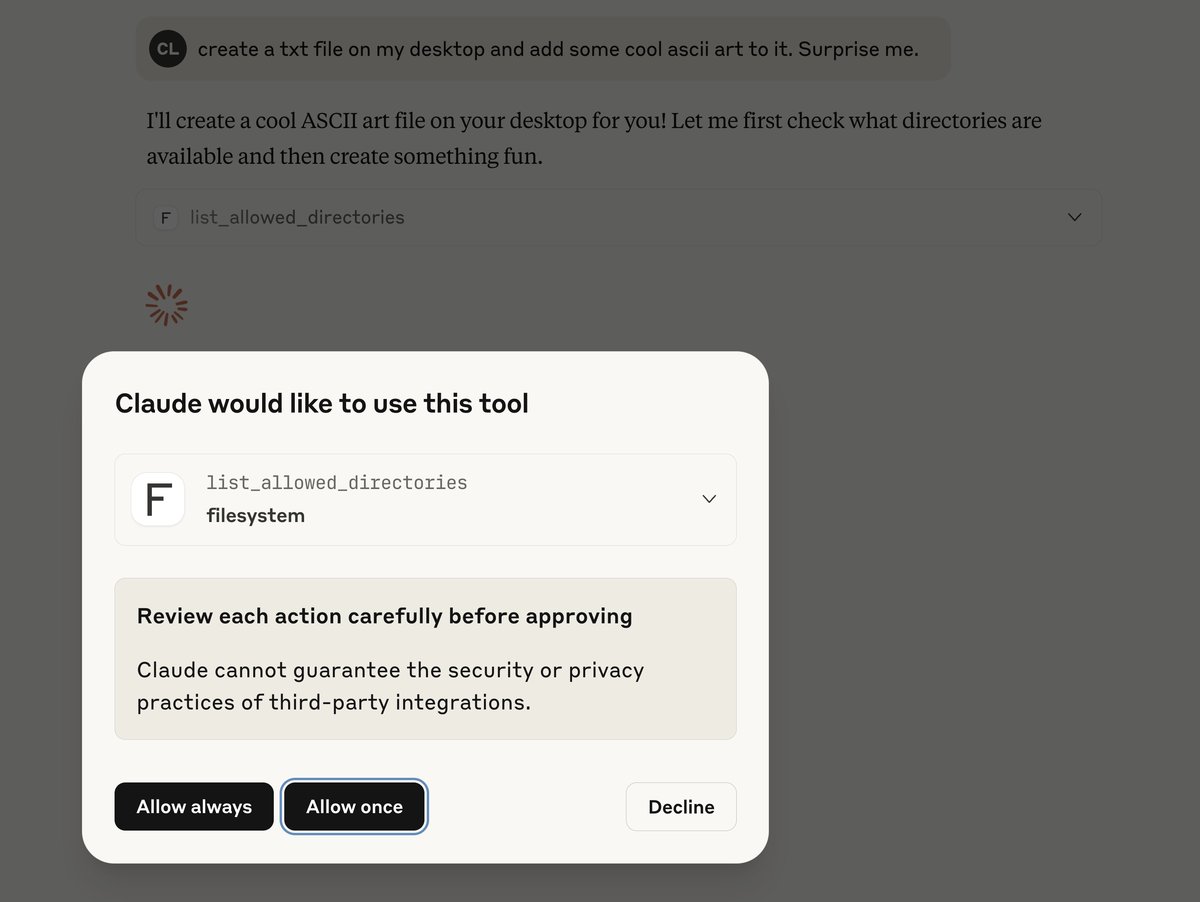 I asked claude to make a text file on my desktop with some ascii art. It figures it can use the file system tools to do this. It asks permission for each step and you have the option to allow always.