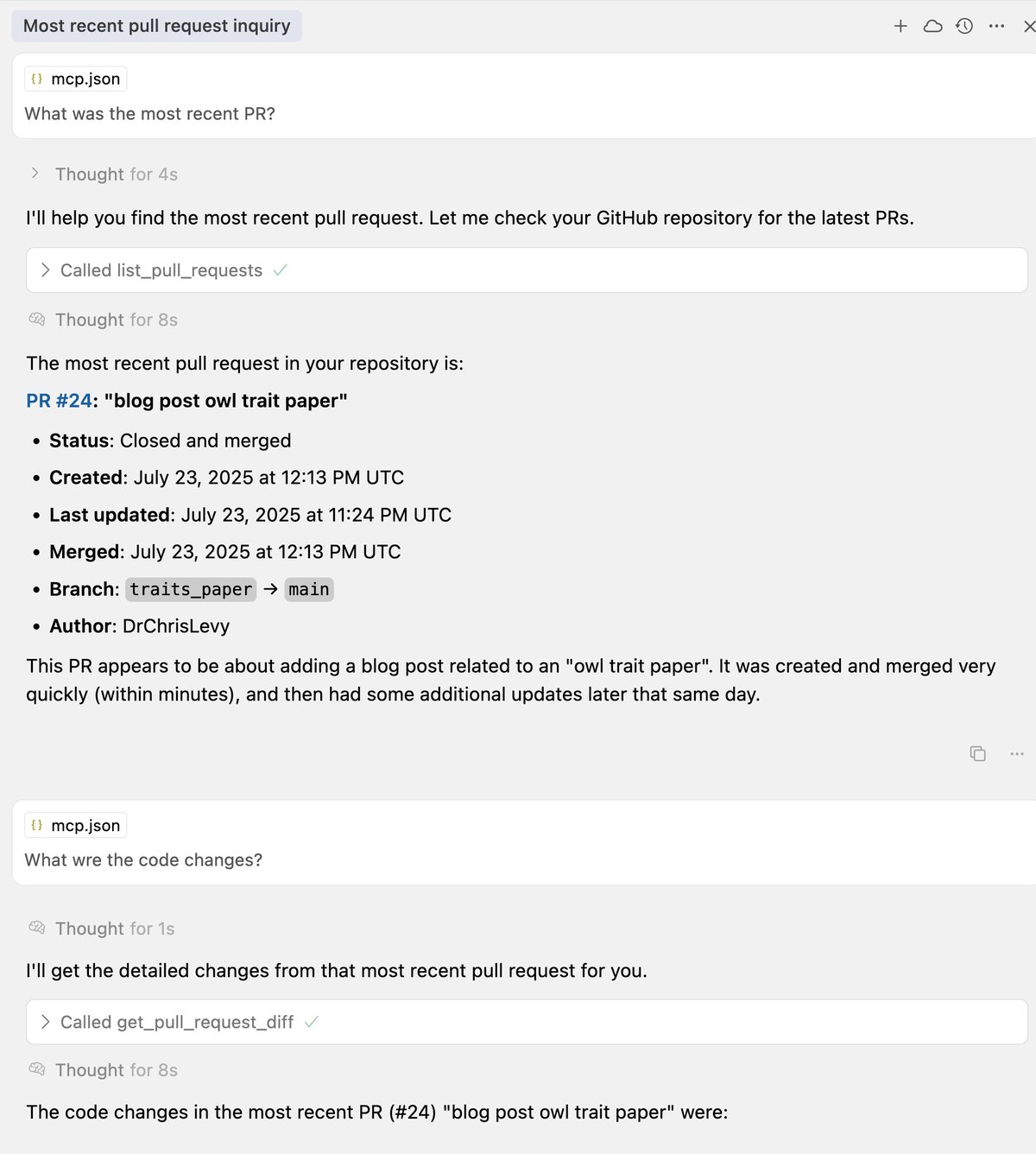 Previous to testing this MCP server, I always told the Cursor LLM agent to use the GitHub CLI to make pull requests, commits, etc. So at this point, I'm not sure what all the value I would personally get from using the MCP server is (since the GitHub CLI was proving quite useful).