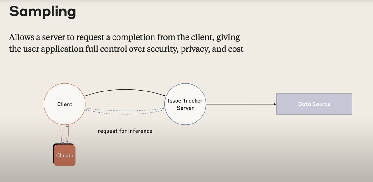 Sampling: Allows servers to request language model completions from the client’s AI application. This is useful when servers authors want access to a language model, but want to stay model independent and not include a language model SDK in their MCP server. They can use the sampling/complete method to request a language model completion from the client’s AI application.