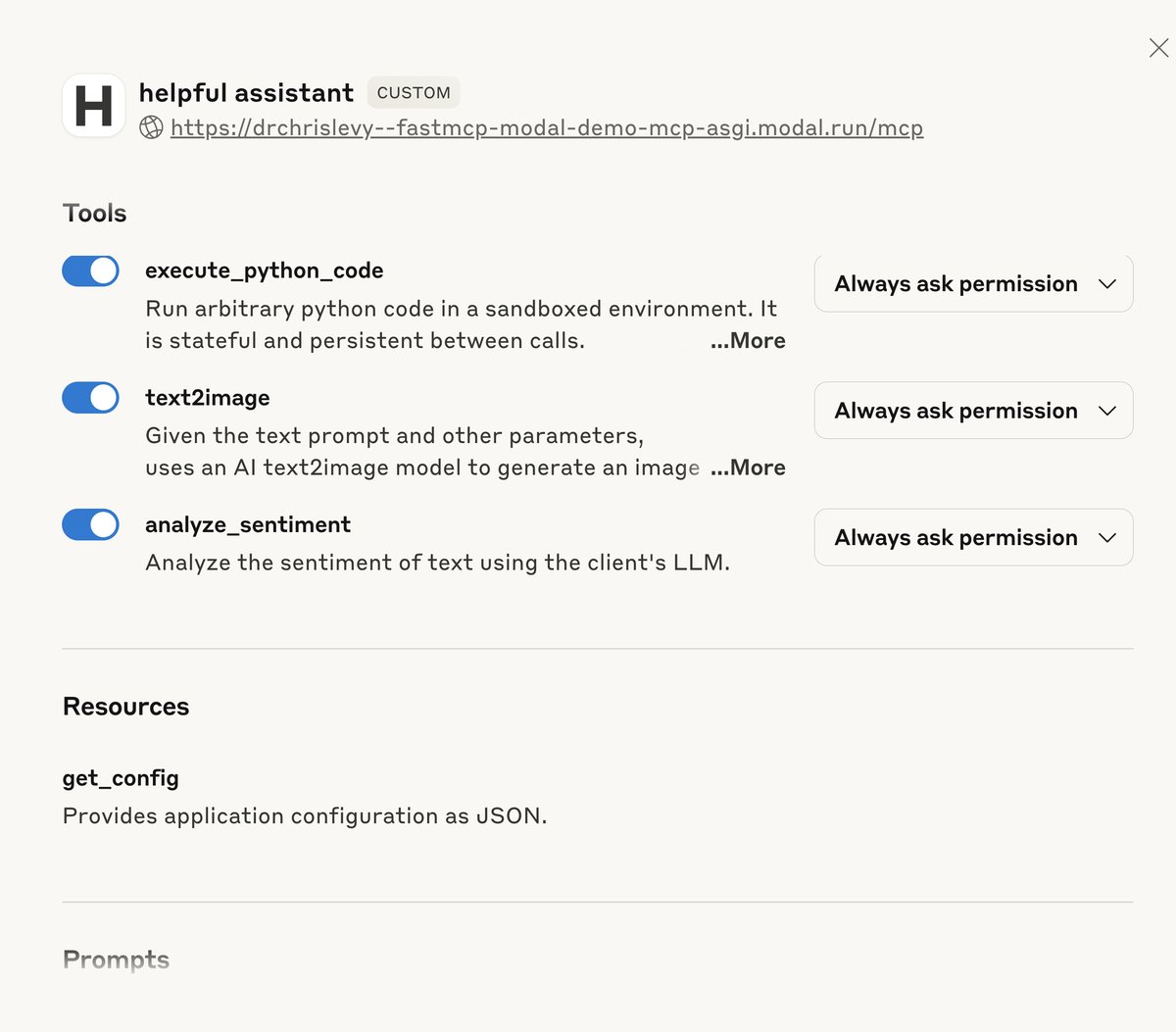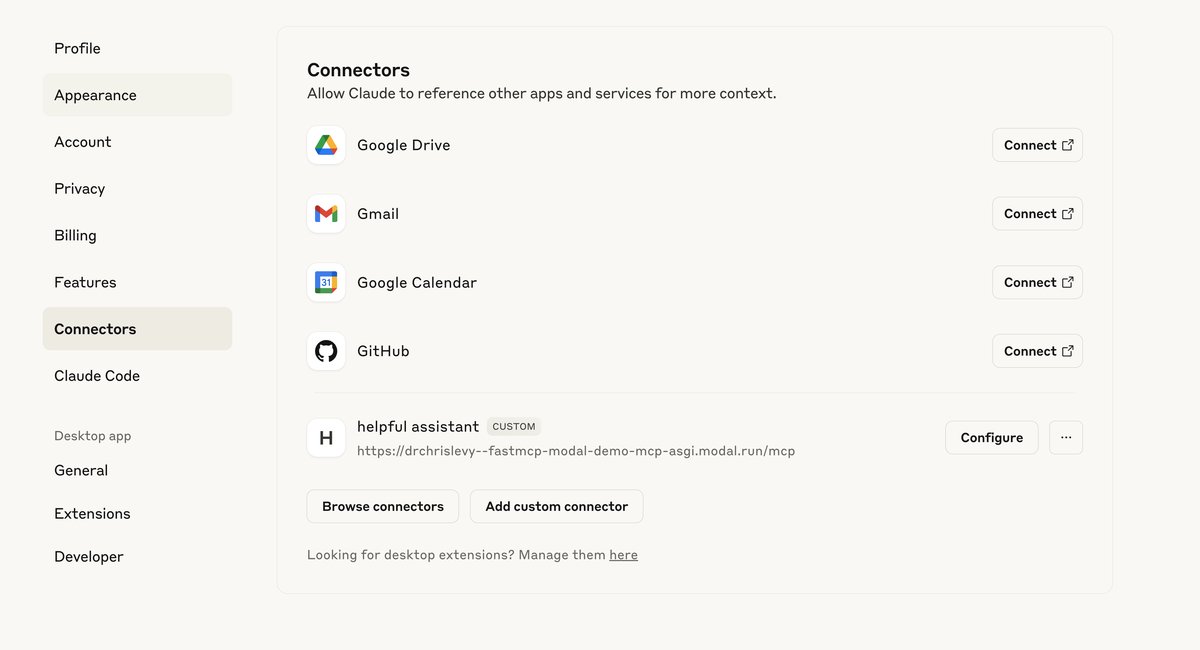 In this post I will deploy a remote MCP server to Modal, and connect it to Claude Desktop. Claude Desktop, as a host with clients, does not support all the functionality of MCP at the moment. However, it's easy to set up.