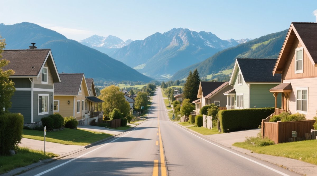 "prompt": 'A beautiful view looking down a road with cute houses on either side and mountains in the background.',